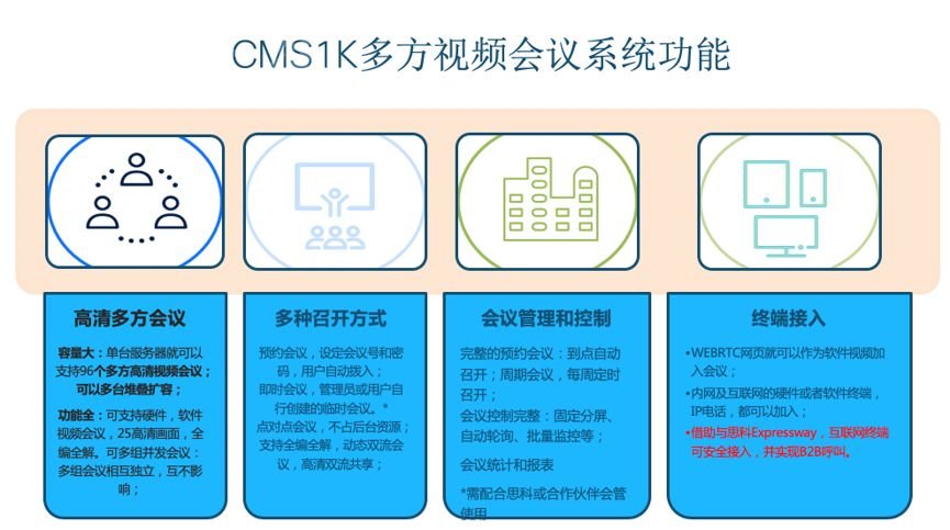 ? 私有云架構(gòu):采用虛擬化部署方式,可以多臺堆疊擴容。單臺CMS1K 服務(wù)器可以支持96個高清軟硬件視頻終端加入的多方會議;