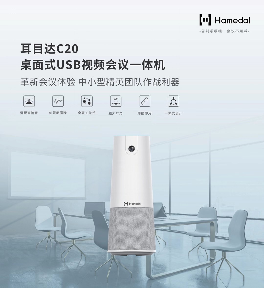 ??Hamedal?C20是蛙聲科技專為中小型精英團(tuán)隊(duì)全新打造的一款桌面式USB視頻會(huì)議視訊終端,該產(chǎn)品擁有100°超大水平視角,支持1080P全高清視頻通話。內(nèi)置4單元全向麥克風(fēng)陣列以及專為人聲優(yōu)化的高品質(zhì)全頻揚(yáng)聲器,結(jié)合蛙聲科技第三代Pure?Vioce音頻技術(shù),可實(shí)現(xiàn)8米優(yōu)質(zhì)全雙工通話,為用戶提供清晰、穩(wěn)定、流暢的音視頻會(huì)議體驗(yàn)。Hamedal C20集攝像頭、麥克風(fēng)、揚(yáng)聲器于一體,USB即插即用,兼容多平臺(tái)視訊軟件,可完美適用于1-8人會(huì)議室,是各類(lèi)企業(yè)提升遠(yuǎn)程協(xié)作效率的必備利器。