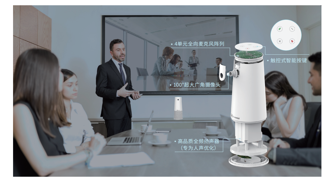 Hamedal C20集攝像頭、麥克風(fēng)、揚(yáng)聲器于一體,機(jī)身小巧不占空間,可置于任意辦公場(chǎng)所的桌面使用,讓您隨時(shí)隨地暢享即時(shí)無(wú)憂通話。其頂部配備4個(gè)觸控式按鍵,支持一鍵靜音、關(guān)閉攝像頭等操作。一體式集成化設(shè)計(jì)與豐富的通話控制功能,帶來(lái)便捷友好的品質(zhì)會(huì)議體驗(yàn)。| ? | |